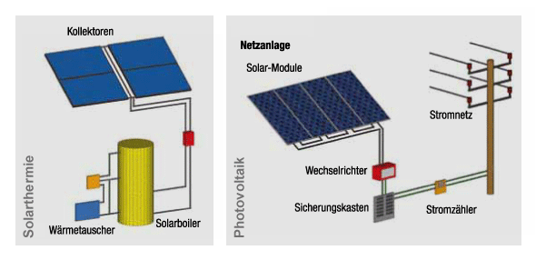 Seit Milliarden von Jahren produziert die Sonne unerschöpfliche Energie. Die eingestrahlte Sonnenenergie auf unsere Erde ist um das 15'000-fache grösser als der globale Energiebedarf. Es liegt deshalb auf der Hand, dass man diese Energiequelle nutzen kann und auch soll.Unter den Solaranlagen werden zwei Systeme unterschieden, die eine aktive Nutzung der Sonnenenergie erlauben: Solarthermie und Photovoltaik.